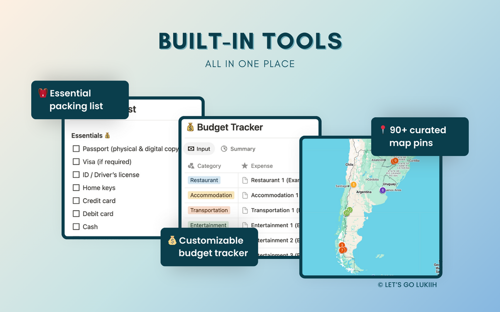 Built in Notion, this customizable planner keeps your trip organized in one place with drag-and-drop daily plans, offline access, and simple checklists to reduce planning stress.
