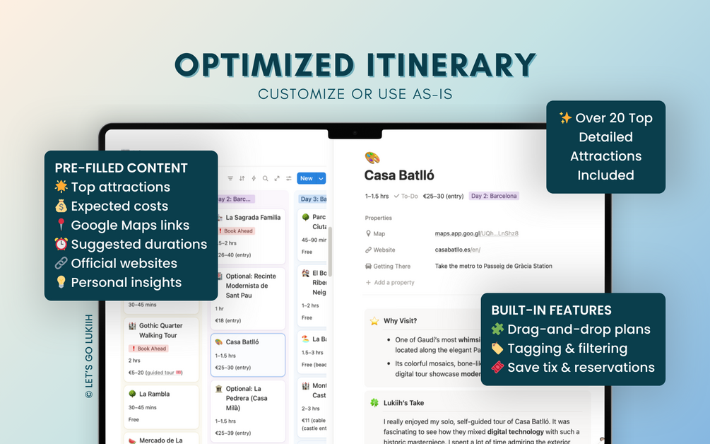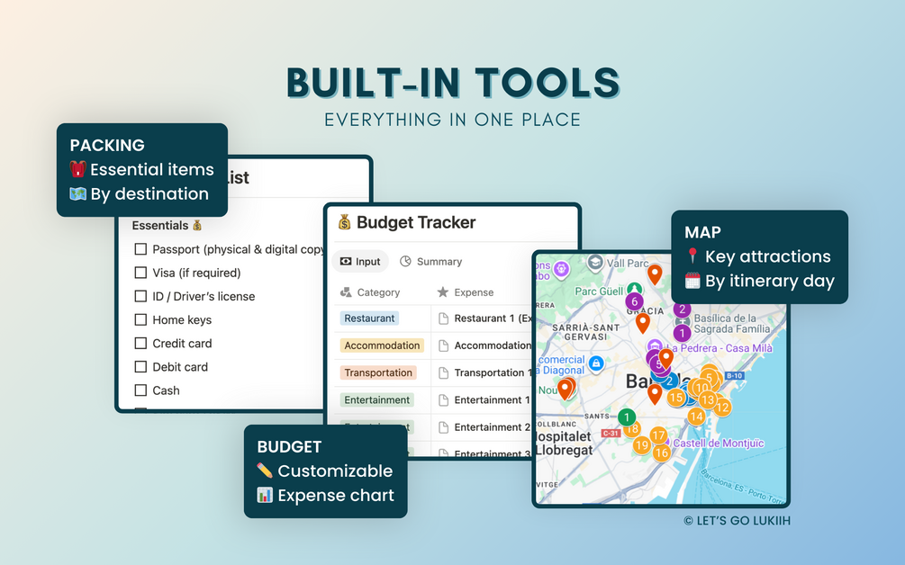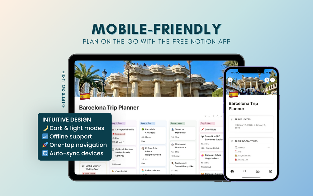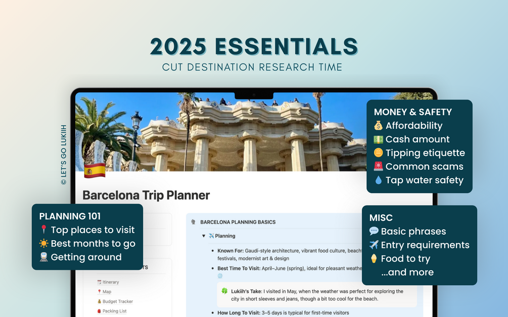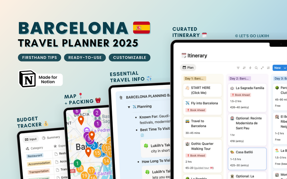 Built in Notion, this customizable itinerary features drag-and-drop functionality, offline access, and simple checklists to simplify trip planning.