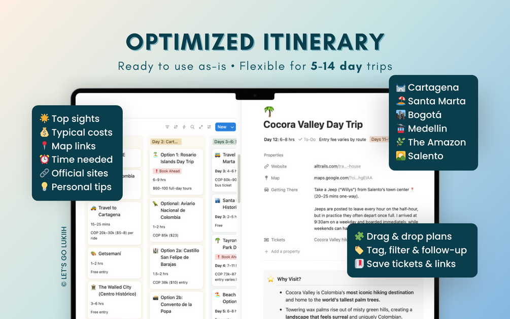Drag-and-drop daily itinerary with top sights, timing, costs, and map links for 5–14 day trips. Built around a flexible 14-day route covering Cartagena, Santa Marta, Medellín, Bogotá, Salento, and the Amazon Rainforest.