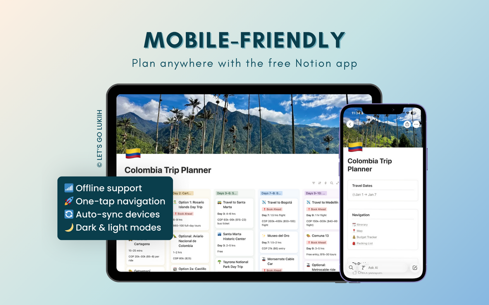 This planner runs in Notion, a free, browser-based workspace with drag-and-drop plans, offline access, simple checklists, and more. It’s the tool I use to plan all my trips.
