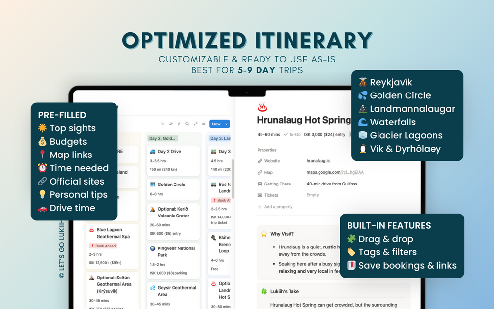 Drag-and-drop daily plans with must-see sights, time estimates, driving durations, mileage, and Google Maps routes, along with personal tips. Includes a flexible 7-day route focused on Iceland's South Coast, adjustable for 5–9 day trips.