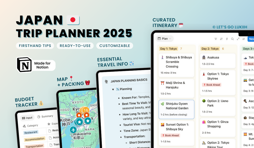 Built in Notion, this customizable itinerary features drag-and-drop functionality, offline access, and simple checklists to make trip planning easier.