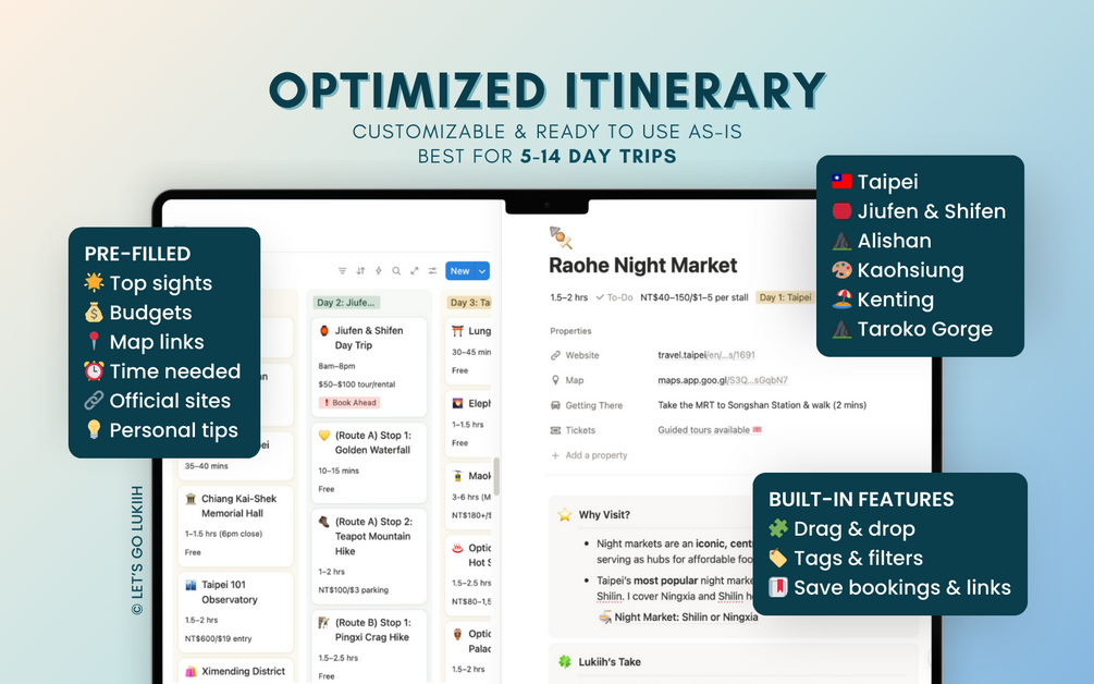 Drag-and-drop daily plans with must-see sights, time estimates, map links, and personal tips. Includes a flexible 7-day route covering Taipei, Jiufen & Shifen, Alishan, Kaohsiung, Kenting, and Taroko Gorge, adjustable for 5โ14 day trips.