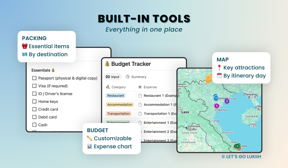 Built in Notion, this customizable itinerary features drag-and-drop functionality, offline access, and simple checklists to make trip planning easier.