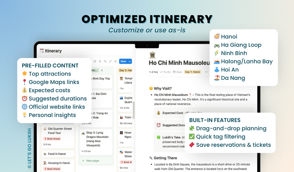 - ποΈ Itinerary β Drag-and-drop daily plans with must-see attractions and personal tips. The default is a flexible 12-day itinerary covering Hanoi, Ninh Binh, Ha Giang Loop, Ha Long Bay/Lan Ha Bay, Hoi An, and Da Nang, easily extendable to 2 weeks.
